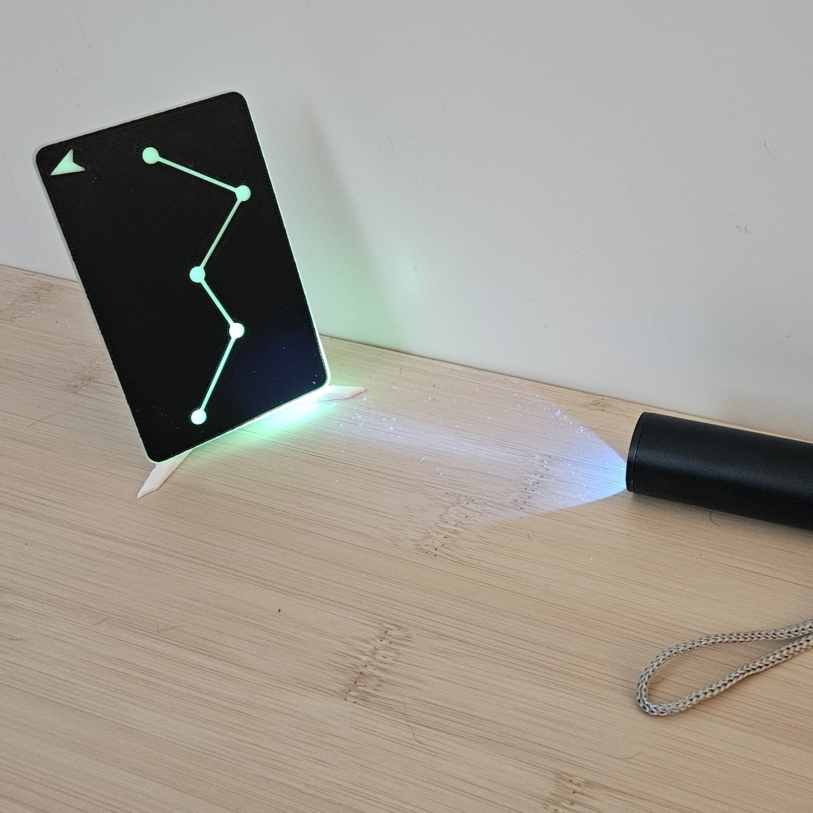 האור המותאם “מטעין” את שכבת הזוהר של קלפי StarQuest ביעילות גבוהה יותר מפנס לבן רגיל, כך שהקלפים זוהרים חזק יותר ולזמן ארוך יותר. מספיק להאיר ממרחק 20–30 ס״מ במשך כ-5 שניות לכל קלף.